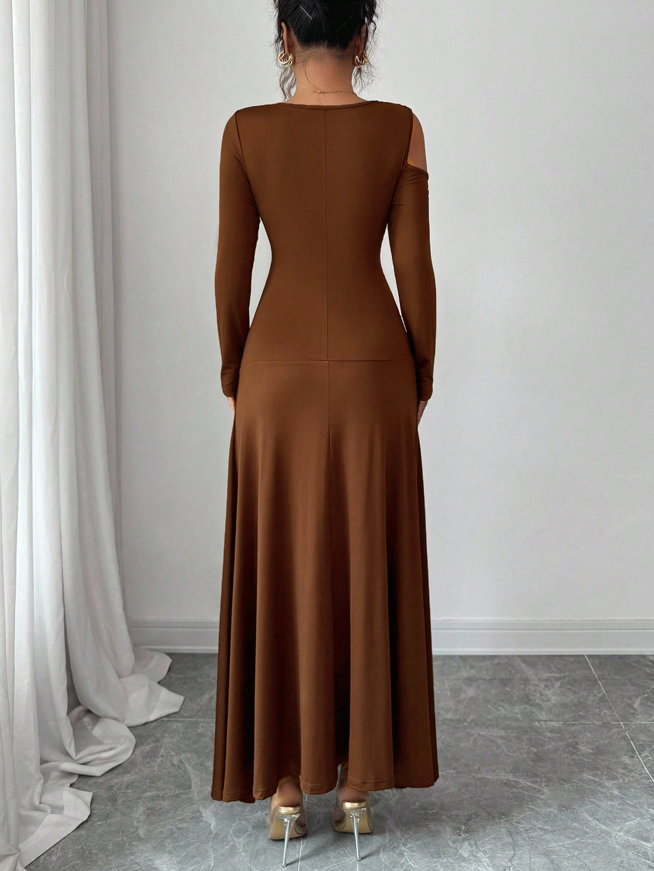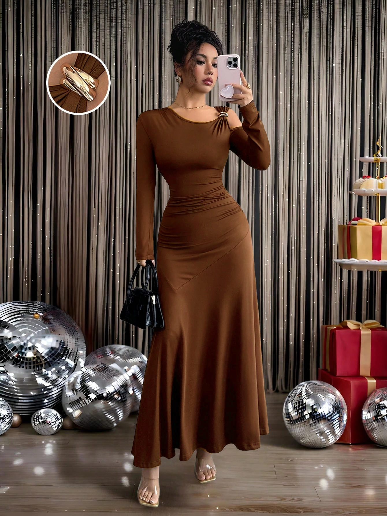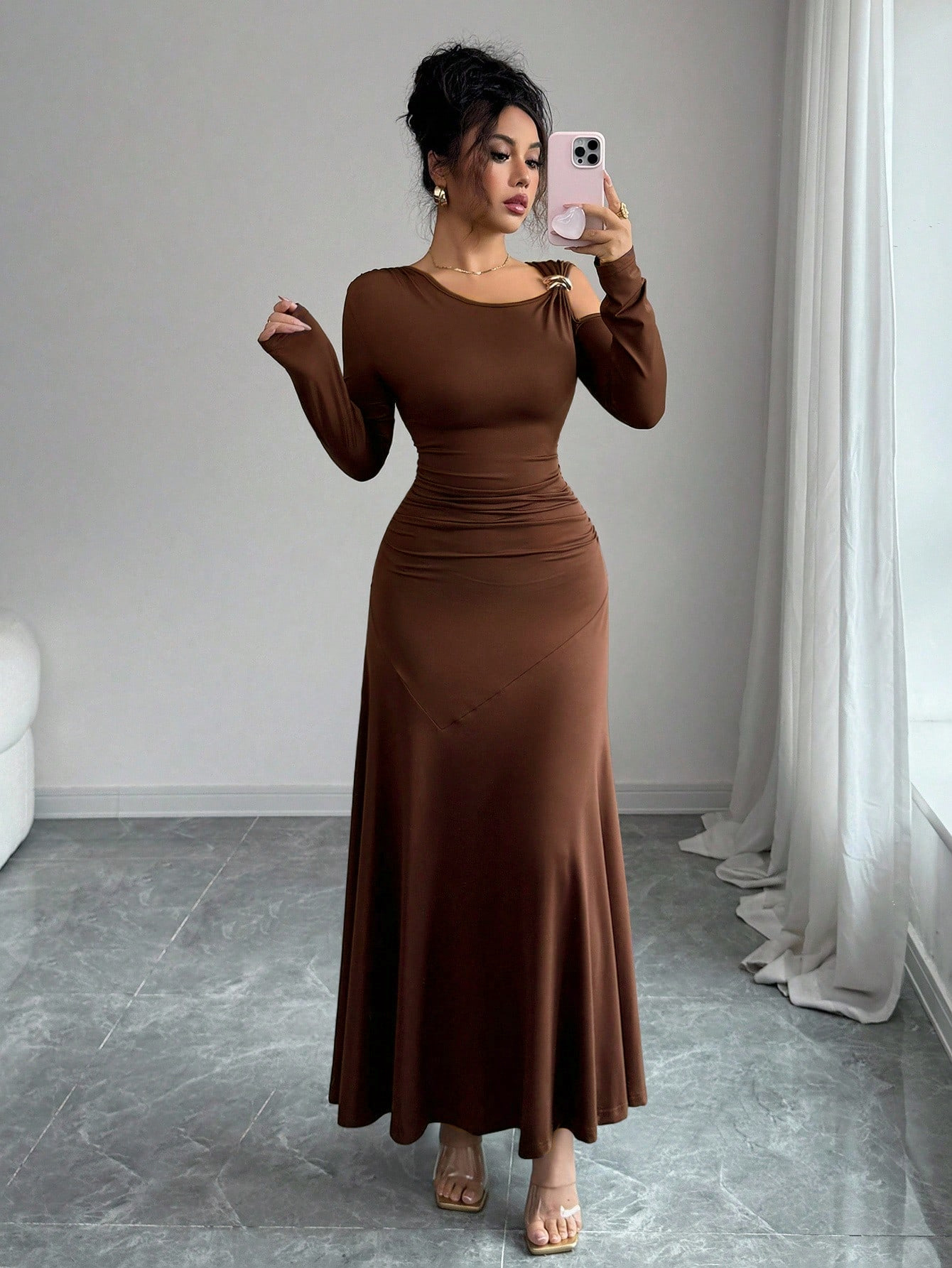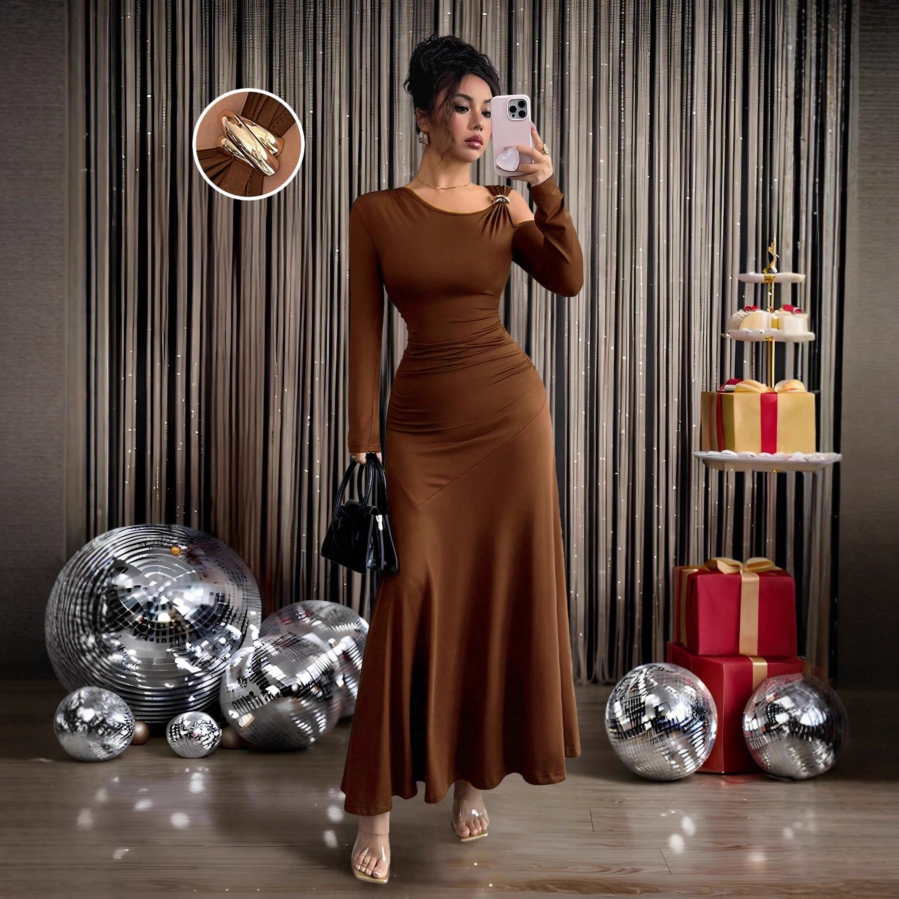 Women's Solid-color Off-shoulder Long-sleeve Top With Metal-decorated Dress